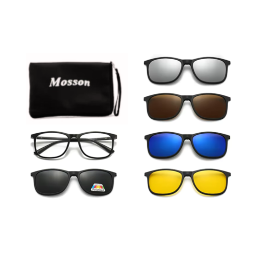 Con los lentes de 5 clips Mosson, ya no necesitarás cargar con múltiples pares de gafas. Este sistema "todo en uno" te ofrece la libertad de pasar de tus lentes de uso diario a unas gafas de sol o de conducción en cuestión de segundos. Su estuche compacto y diseñado a medida te permite llevar todos los clips de manera organizada y segura.