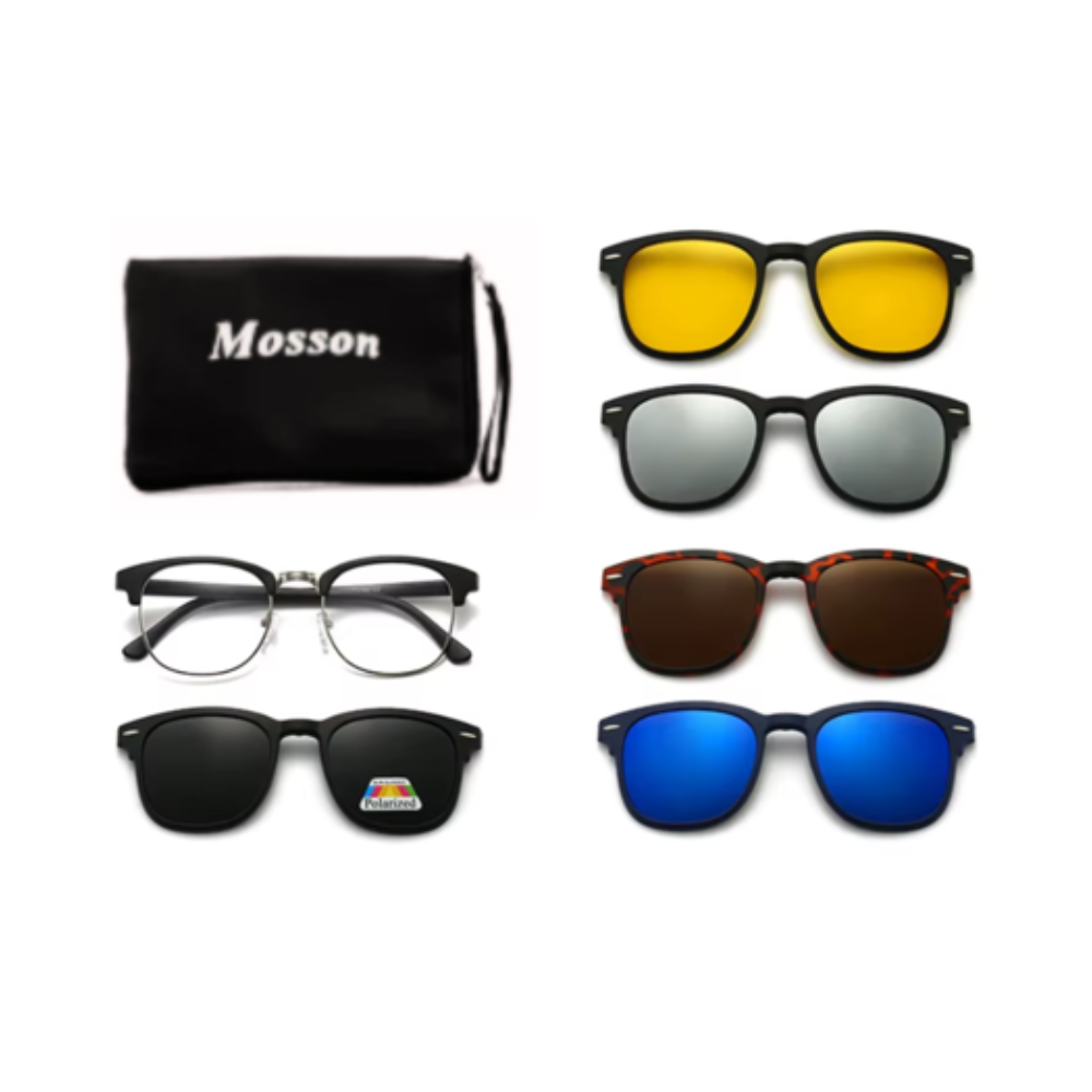Con los lentes de 5 clips Mosson, ya no necesitarás cargar con múltiples pares de gafas. Este sistema "todo en uno" te ofrece la libertad de pasar de tus lentes de uso diario a unas gafas de sol o de conducción en cuestión de segundos. Su estuche compacto y diseñado a medida te permite llevar todos los clips de manera organizada y segura.