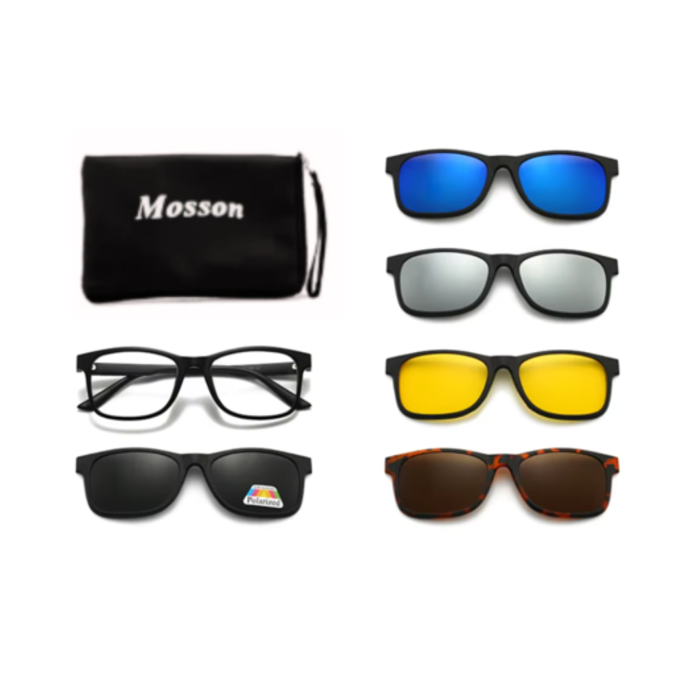 Con los lentes de 5 clips Mosson, ya no necesitarás cargar con múltiples pares de gafas. Este sistema "todo en uno" te ofrece la libertad de pasar de tus lentes de uso diario a unas gafas de sol o de conducción en cuestión de segundos. Su estuche compacto y diseñado a medida te permite llevar todos los clips de manera organizada y segura.