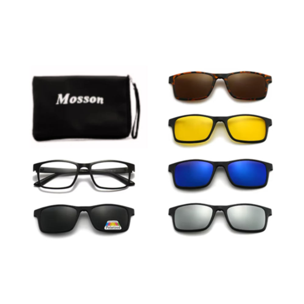 Con los lentes de 5 clips Mosson, ya no necesitarás cargar con múltiples pares de gafas. Este sistema "todo en uno" te ofrece la libertad de pasar de tus lentes de uso diario a unas gafas de sol o de conducción en cuestión de segundos. Su estuche compacto y diseñado a medida te permite llevar todos los clips de manera organizada y segura.