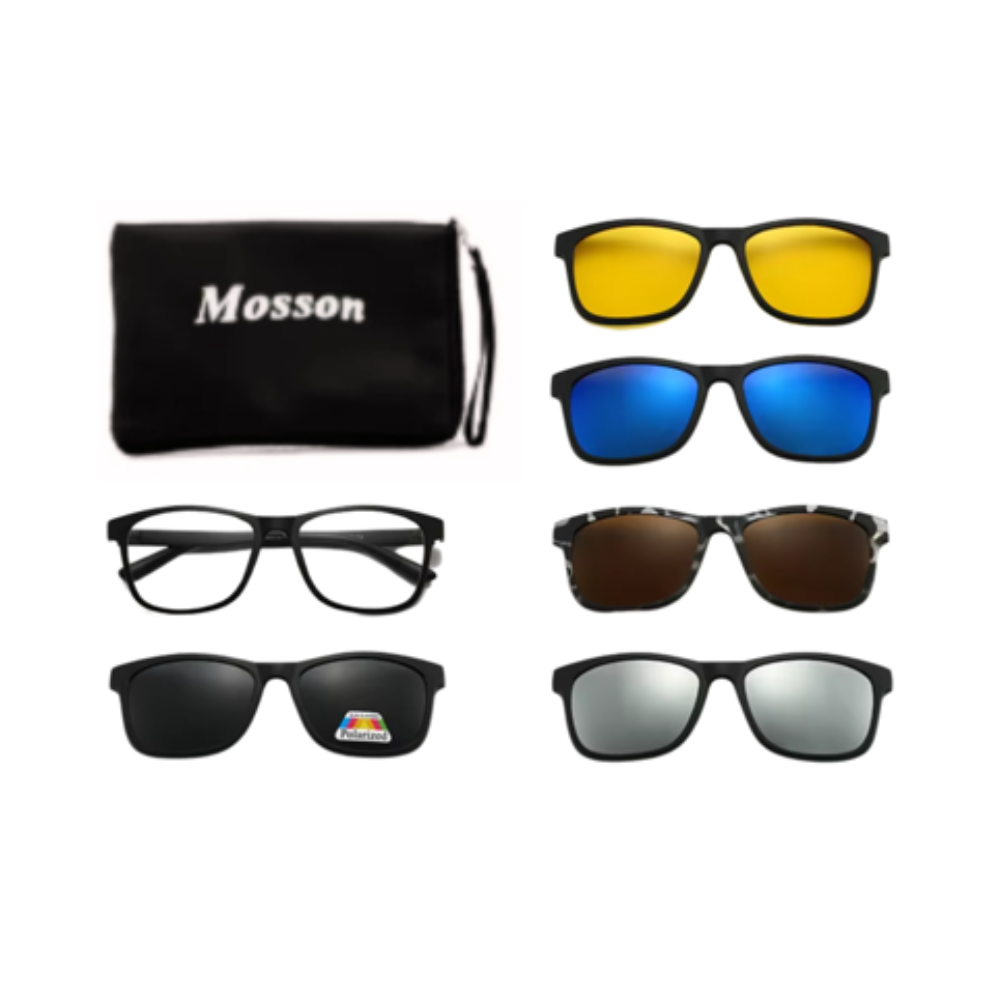 Con los lentes de 5 clips Mosson, ya no necesitarás cargar con múltiples pares de gafas. Este sistema "todo en uno" te ofrece la libertad de pasar de tus lentes de uso diario a unas gafas de sol o de conducción en cuestión de segundos. Su estuche compacto y diseñado a medida te permite llevar todos los clips de manera organizada y segura.