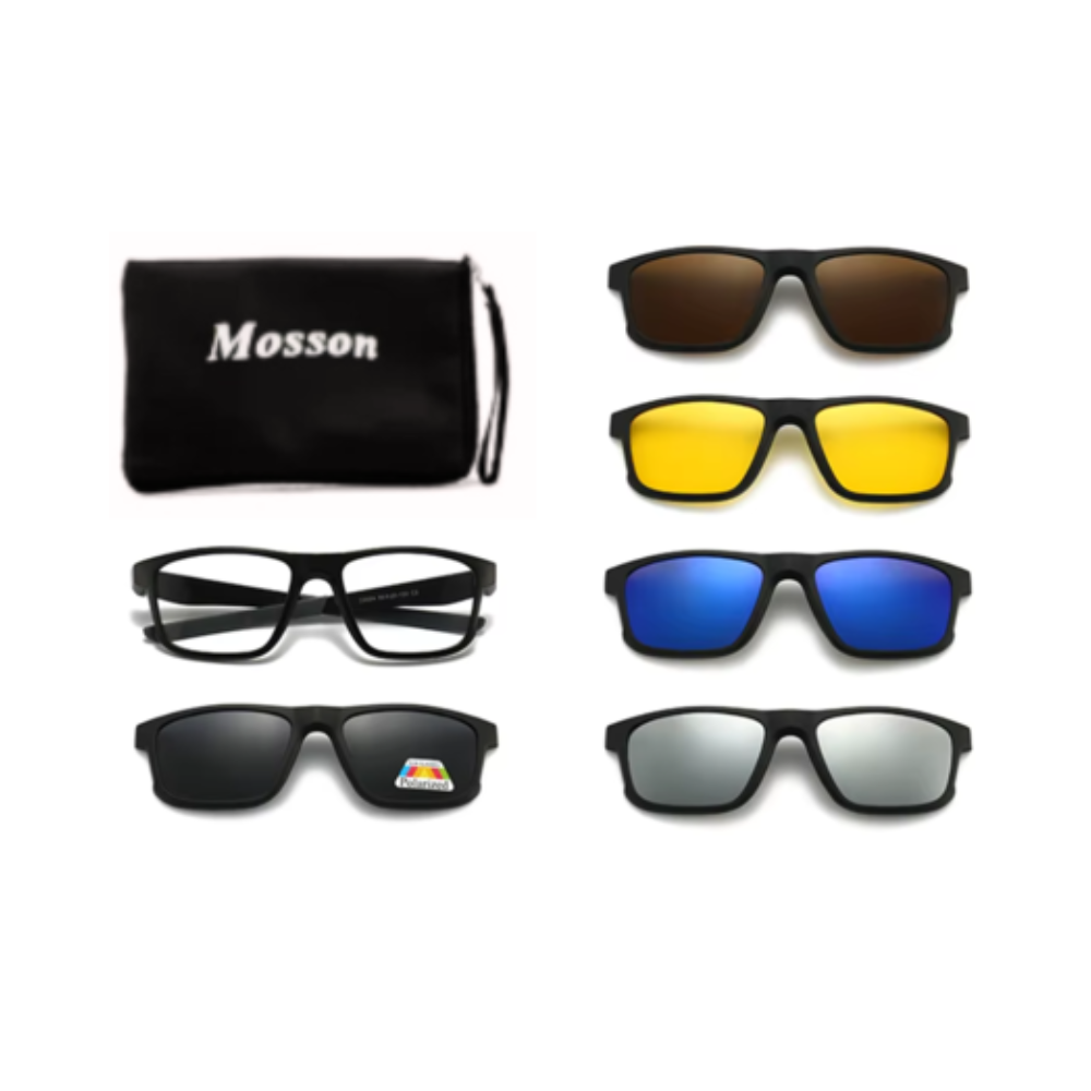 Con los lentes de 5 clips Mosson, ya no necesitarás cargar con múltiples pares de gafas. Este sistema "todo en uno" te ofrece la libertad de pasar de tus lentes de uso diario a unas gafas de sol o de conducción en cuestión de segundos. Su estuche compacto y diseñado a medida te permite llevar todos los clips de manera organizada y segura.