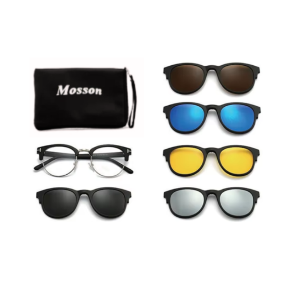 Con los lentes de 5 clips Mosson, ya no necesitarás cargar con múltiples pares de gafas. Este sistema "todo en uno" te ofrece la libertad de pasar de tus lentes de uso diario a unas gafas de sol o de conducción en cuestión de segundos. Su estuche compacto y diseñado a medida te permite llevar todos los clips de manera organizada y segura.