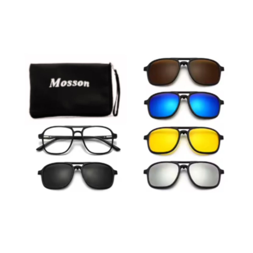 Con los lentes de 5 clips Mosson, ya no necesitarás cargar con múltiples pares de gafas. Este sistema "todo en uno" te ofrece la libertad de pasar de tus lentes de uso diario a unas gafas de sol o de conducción en cuestión de segundos. Su estuche compacto y diseñado a medida te permite llevar todos los clips de manera organizada y segura.